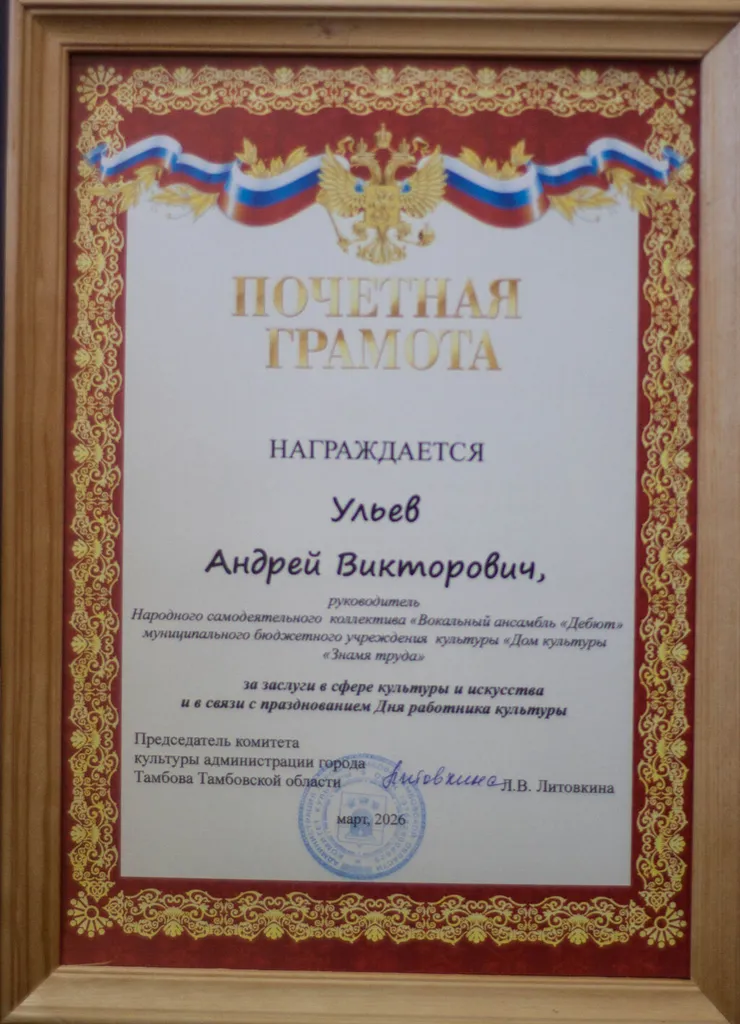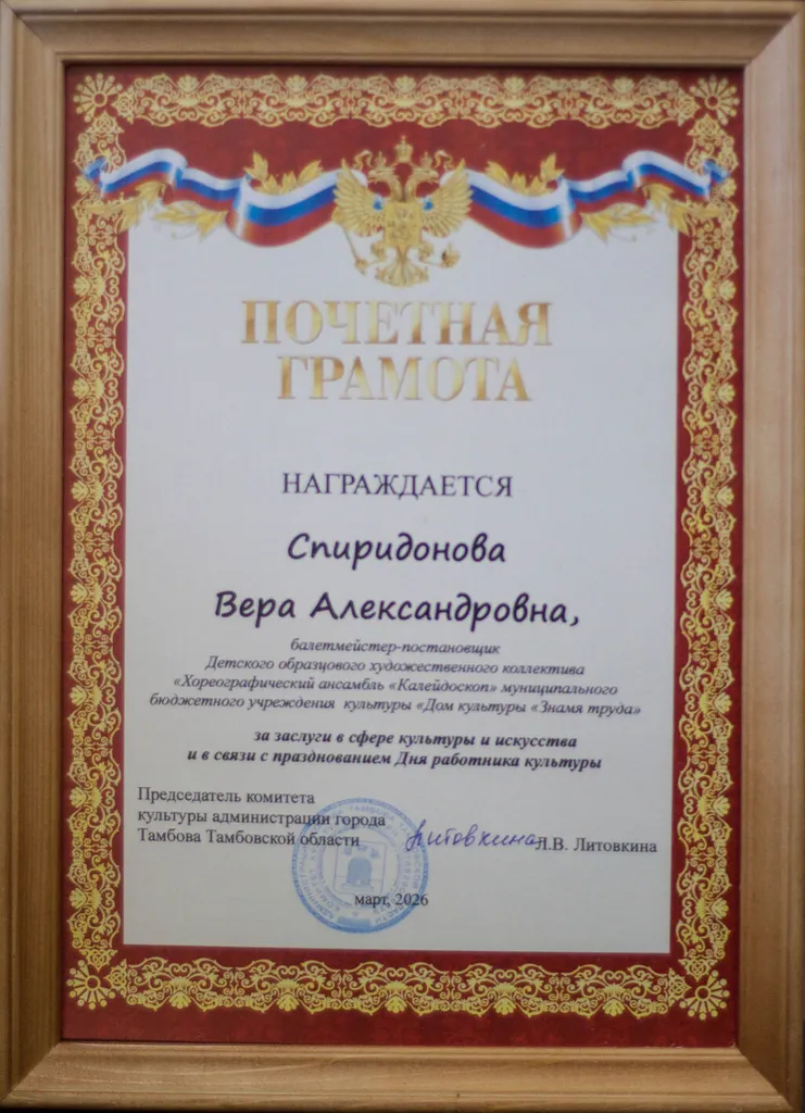 Вера Александровна Спиридонова, руководитель образцового хореографического ансамбля «Калейдоскоп», и Андрей Викторович Ульев, руководитель народного коллектива вокального ансамбля «Дебют», награждены Почётными грамотами Комитета культуры администрации г. Тамбова.