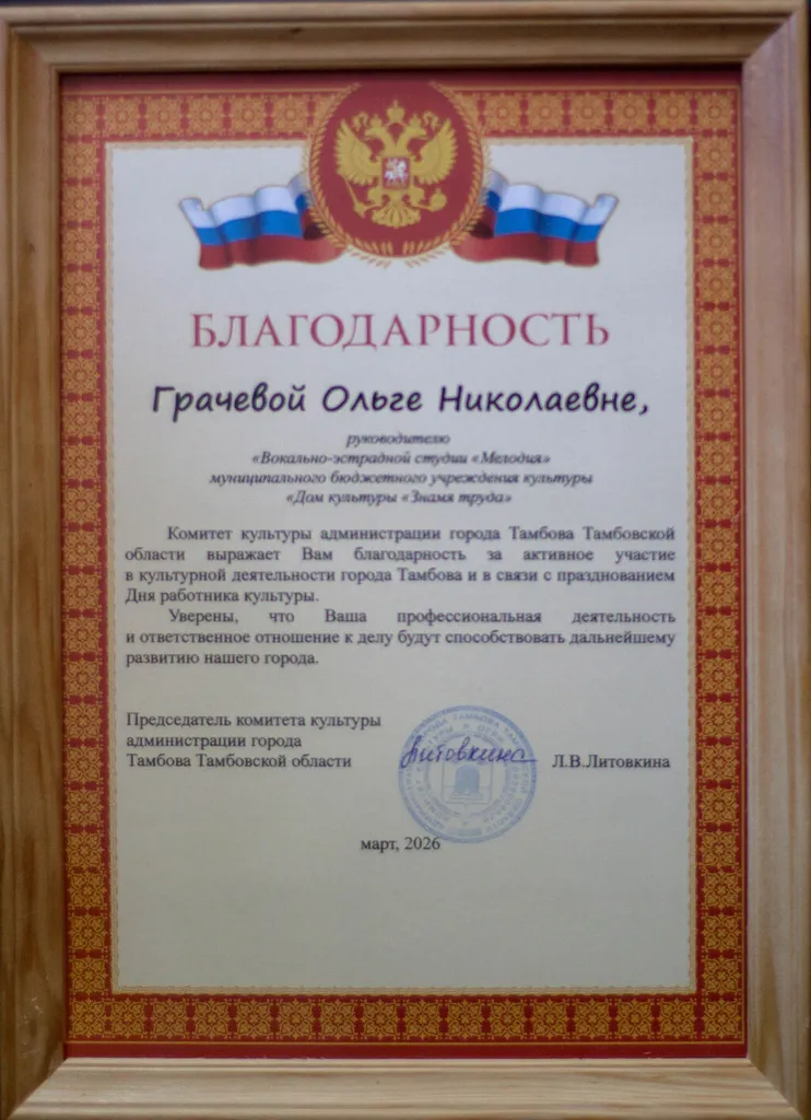 Ольга Николаевна Грачёва, руководитель вокально‑эстрадной студии «Мелодия», отмечена Благодарностью Комитета культуры администрации г. Тамбова.