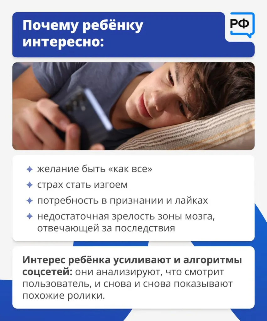 Интерес ребёнка усиливают и алгоритмы соцсетей: они анализируют, что смотрит пользователь, и снова и снова показывают похожие ролики.